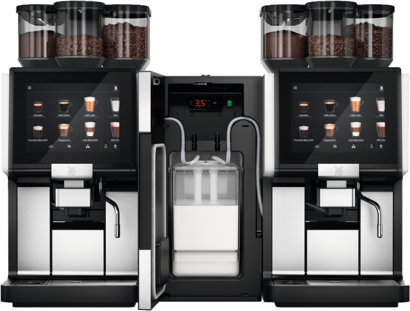 The WMF 1500S+ offers three milk systems: Basic Milk for hot milk/foam, Easy Milk for hot/cold milk or foam, and Dynamic Milk for diverse consistencies of hot/cold milk foam and milk.