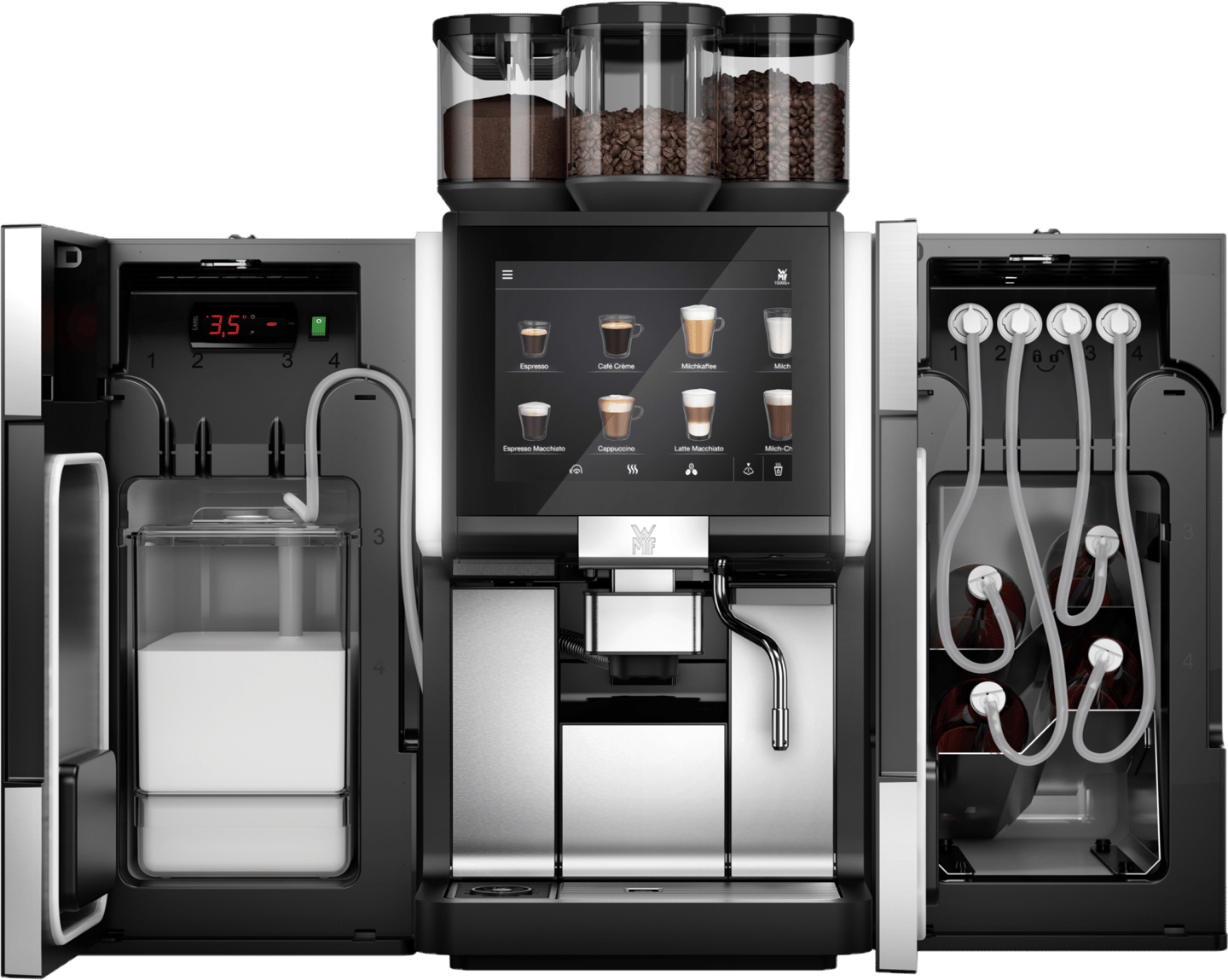 The WMF AutoClean system independently cleans milk and coffee systems automatically, starting without manual effort. It precisely doses cleaning granulate and liquid, ensuring thorough, efficient, and effortless maintenance.