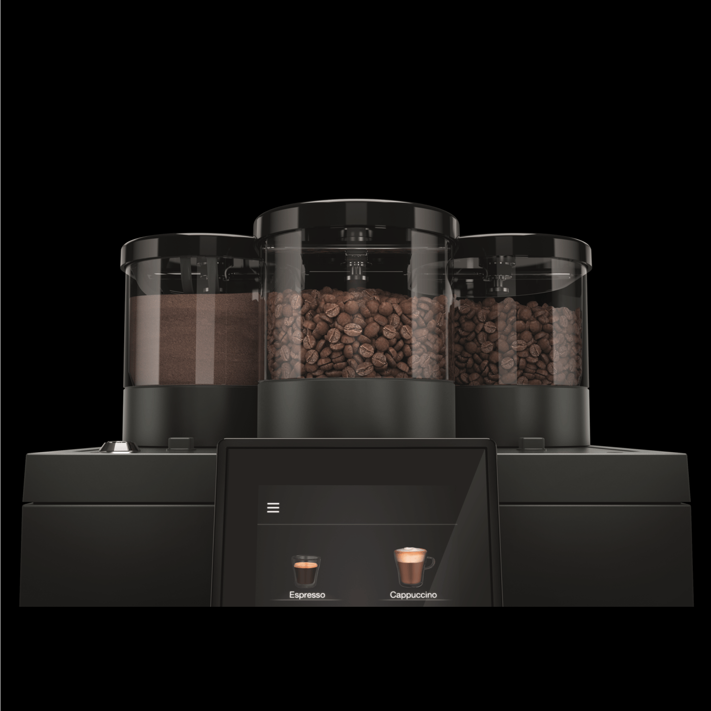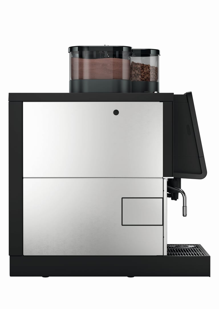 The WMF 1300 S features up to two coffee bean hoppers and one for chocolate or milk powder, all removable for cleaning. Optional lockable hoppers enhance convenience while ensuring variety in beverage offerings.