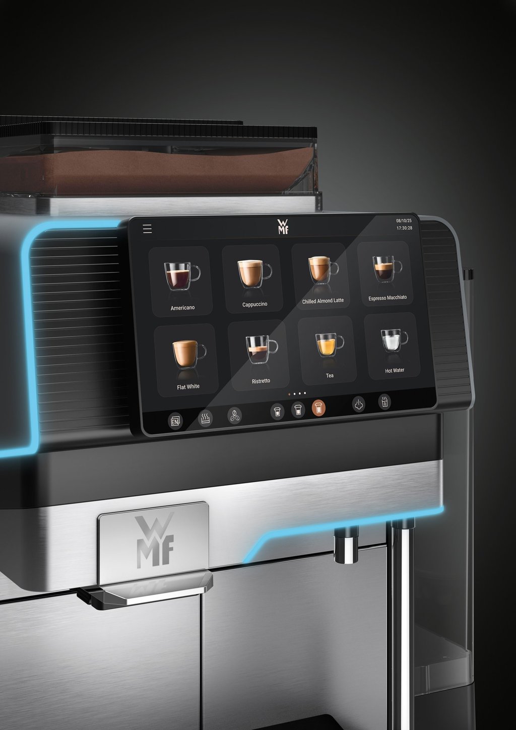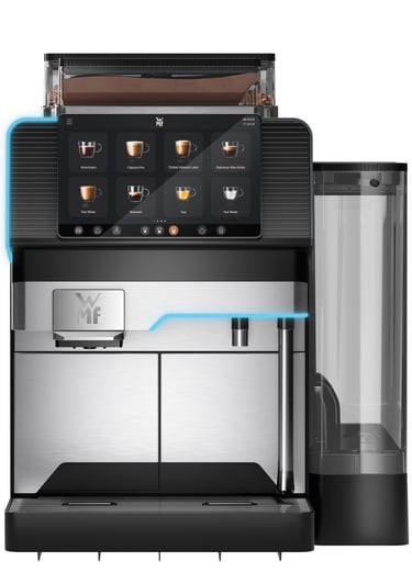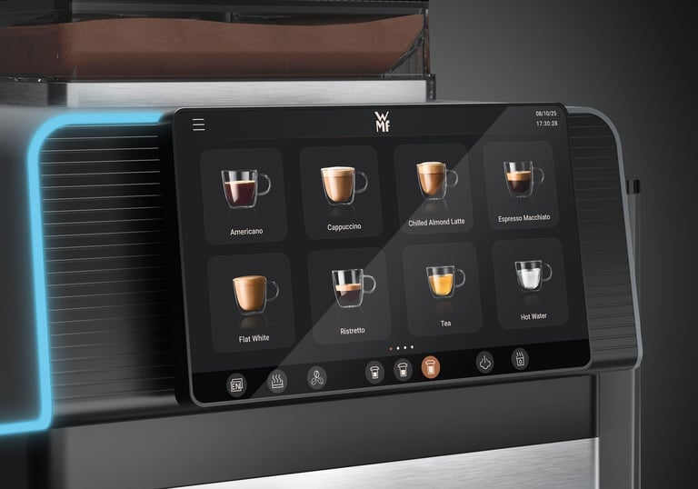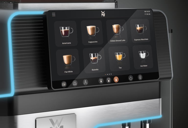 With the WMF Elevation 10, every interaction feels effortless thanks to intuitive navigation on the large 7-inch touch display. Customize drinks, save your favorites, and enjoy – whether in staff mode or self-service. Also available with a 10-inch configurable touch display (for specific markets).
